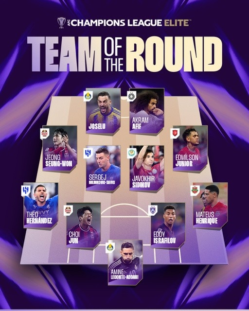 中场:郑承原(首尔FC)、米林科维奇(利雅得眉月)、西迪科夫(纳萨夫)、埃迪米森(杜海勒)