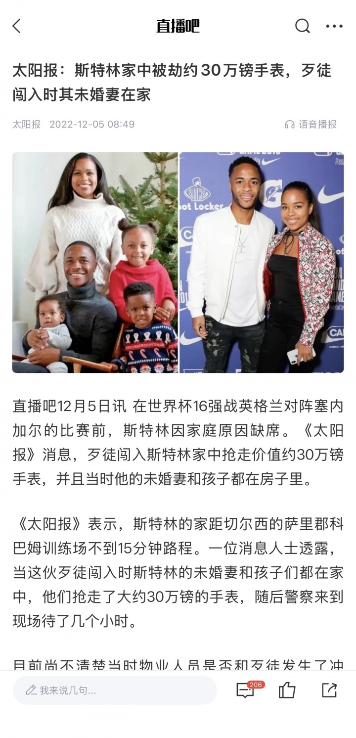 2022年12月卡塔尔宇宙杯本事,斯特林因家庭住宅遭劫一刹离开英格兰队驻地,随后在四分之一决赛前归队。