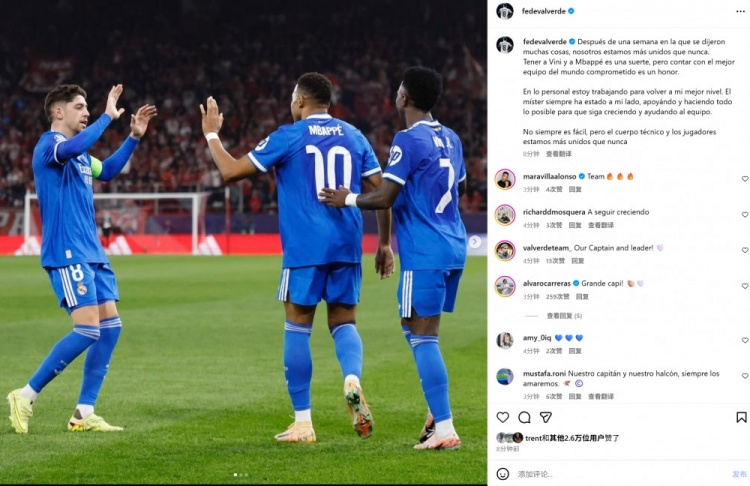 巴尔韦德也在社媒晒出与姆巴佩、维尼修斯庆祝合影,配文写谈:“流程一周的风云,咱们比以往任何技术齐愈加合营。领有维尼修斯和姆巴佩是咱们的红运,但卤莽领有一支任重道远的宇宙最好球队更是咱们的侥幸。就我个东谈主而言,我正在死力还原到最好景色。主辅导一直在我身边提拔我,尽一切可能匡助我连续成长并为球队作念出孝敬。天然并不老是一帆风顺,但咱们辅导组和球员们比以往任何技术齐愈加合营。”