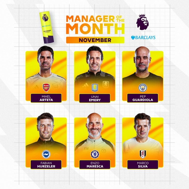 12月4日讯 英超官方公布11月最好主帅候选,阿尔特塔、瓜迪奥拉、马雷斯卡等6名耕作入围。