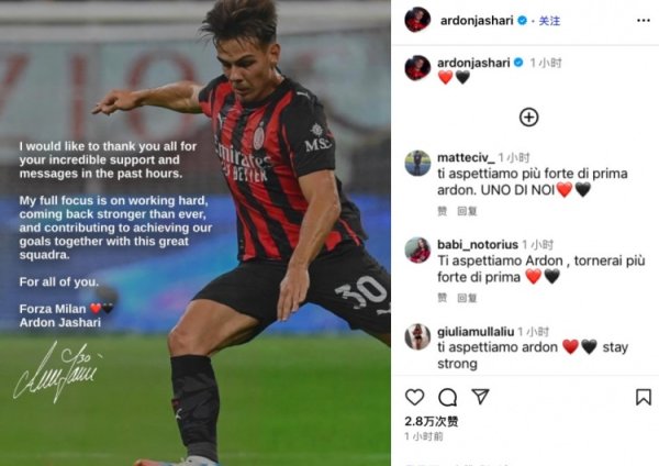 将恒久伤缺😢亚沙里社媒:会以比过往更弘远姿态转头,佛砸米兰