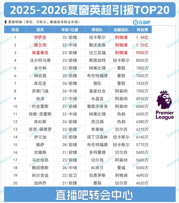 英超夏窗TOP20:利物浦霸榜前三&标王伊萨克 BIG6+纽卡包揽前20