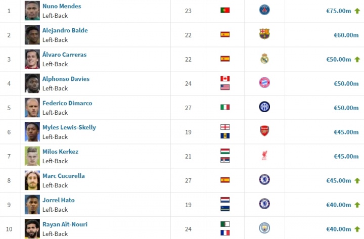 涨1000万!库库雷利亚身价更新后达到4500万欧,各人左后卫排第6