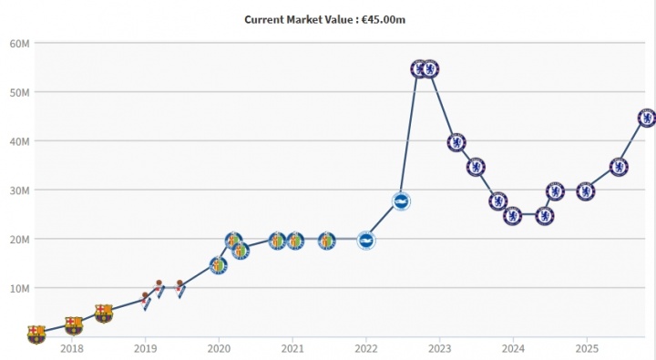 10月18日讯 昨日德转更新英超各队球员身价,其中,切尔西左后卫库库雷利亚身价高涨1000万欧,来到4500万欧。