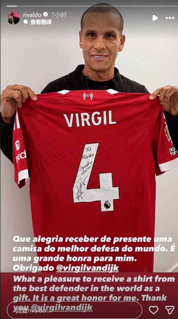 里瓦尔多社媒晒范戴克球衣:很行运收到寰宇最好后卫施济的球衣