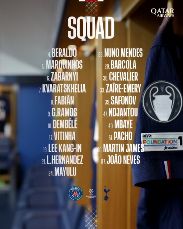 巴黎欧冠对阵热刺大名单:登贝莱缅想,阿什拉夫、杜埃缺席