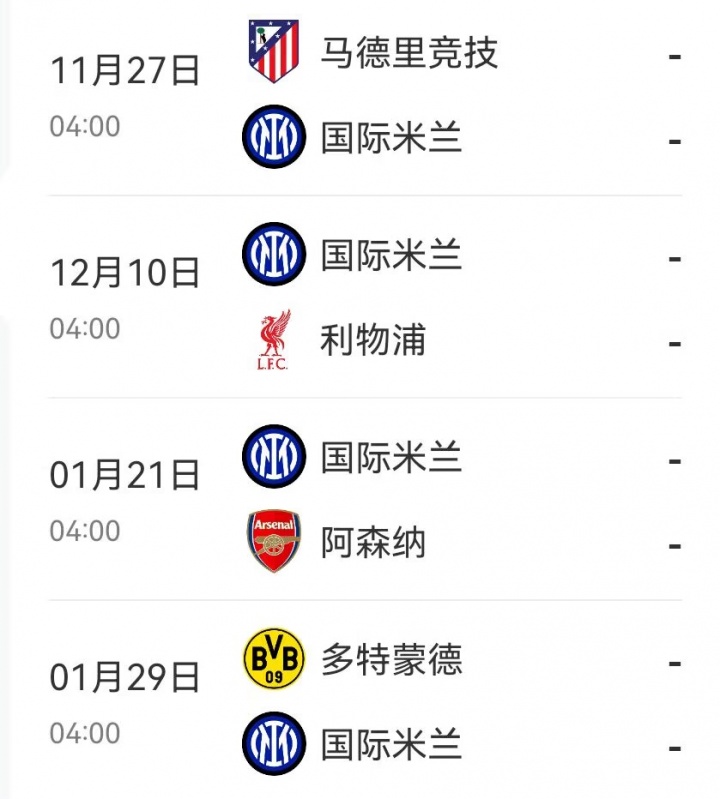 而后,国米仍要濒临三个苍劲的敌手:主场先后迎战利物浦和阿森纳,末轮客战多特。