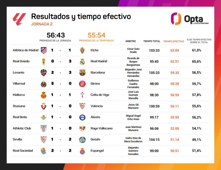 8月26日讯 Opta统计了西甲第二轮的净比赛时间,马竞vs埃尔切净比赛时间63分09秒最长,皇家奥维耶多vs皇马、莱万特vs巴萨二三位。