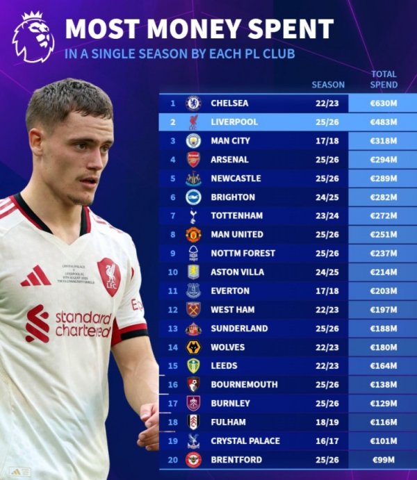 英超各队单赛季最高开销:蓝军22-23赛季6.30亿 利物浦今夏4.83亿
