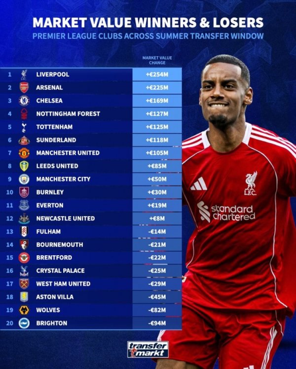 英超夏窗身价变化:利物浦+2.54亿 阿森纳+2.25亿 切尔西+1.69亿