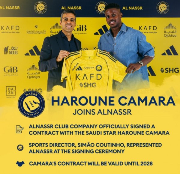利雅得生效官方:利亚德后生东谈主27岁前卫卡马拉加盟,签约至2028年