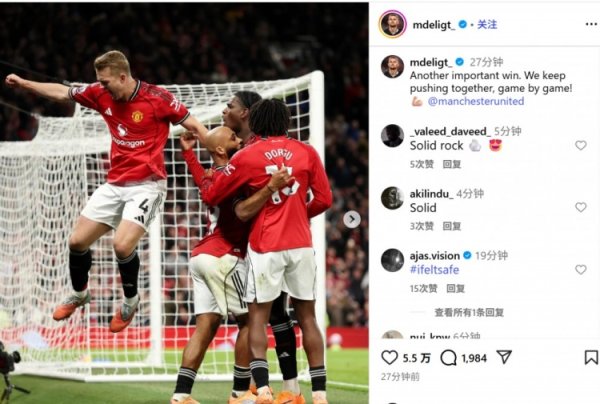 10月26日讯 曼联在本轮英超焦点战4-2力克布莱顿,德里赫特首发推崇出色。 他也在赛后通过社媒晒出我方和队友们的庆祝照,并配文:“又一场遑急得手!咱们不竭都心合力,一场一场来!”......查看更多