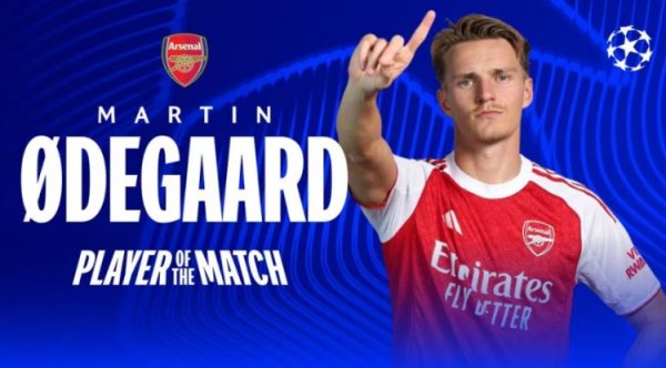 1助攻4枢纽传球,厄德高当选阿森纳2-0奥林匹亚科斯一役全场最好