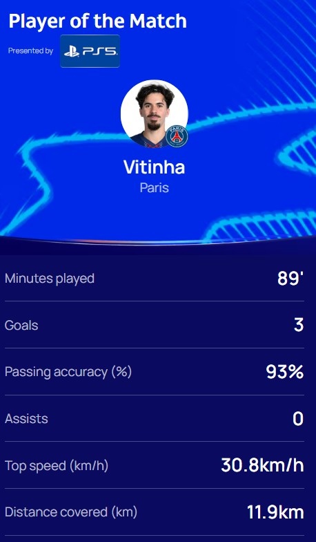 献艺帽子戏法,欧冠官方:维蒂尼亚当选巴黎5-3热刺全场最好球员