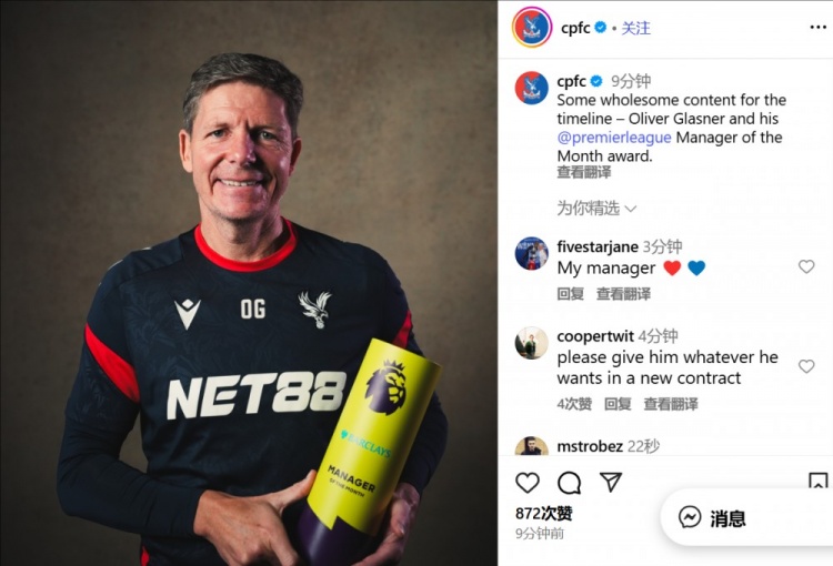 10月14日讯 水晶宫官方晒照,主教训格拉斯纳领取9月份英超最好教训奖项。