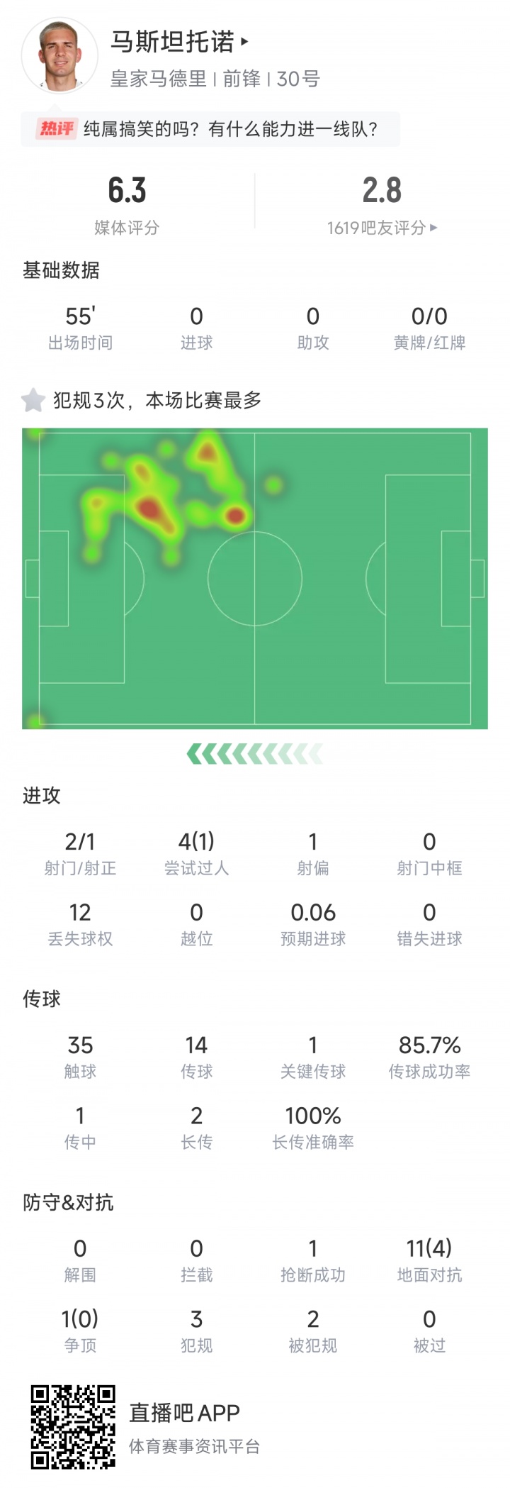 本场比跑马斯坦托诺推崇欠安,遭到球迷吐槽。赛中他还屡次滑倒,拒抗也不占上风,最终机构评分仅6.3分,吧友评分仅2.8分。