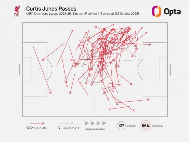 此役柯蒂斯-琼斯为利物浦踢满全场,告捷传球122次,这是2003-2004赛季Opta统计相干数据以来,利物浦球员欧冠单场告捷传球记载。