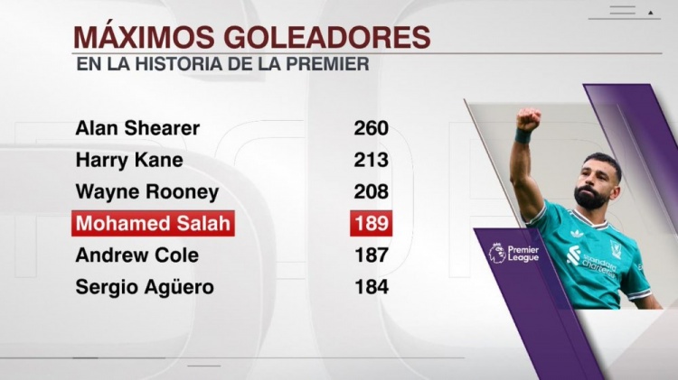 据ESPN统计,萨拉赫当今在英超打进189球,名次历史弓手榜第四位,差19球追平名挨次三的鲁尼。