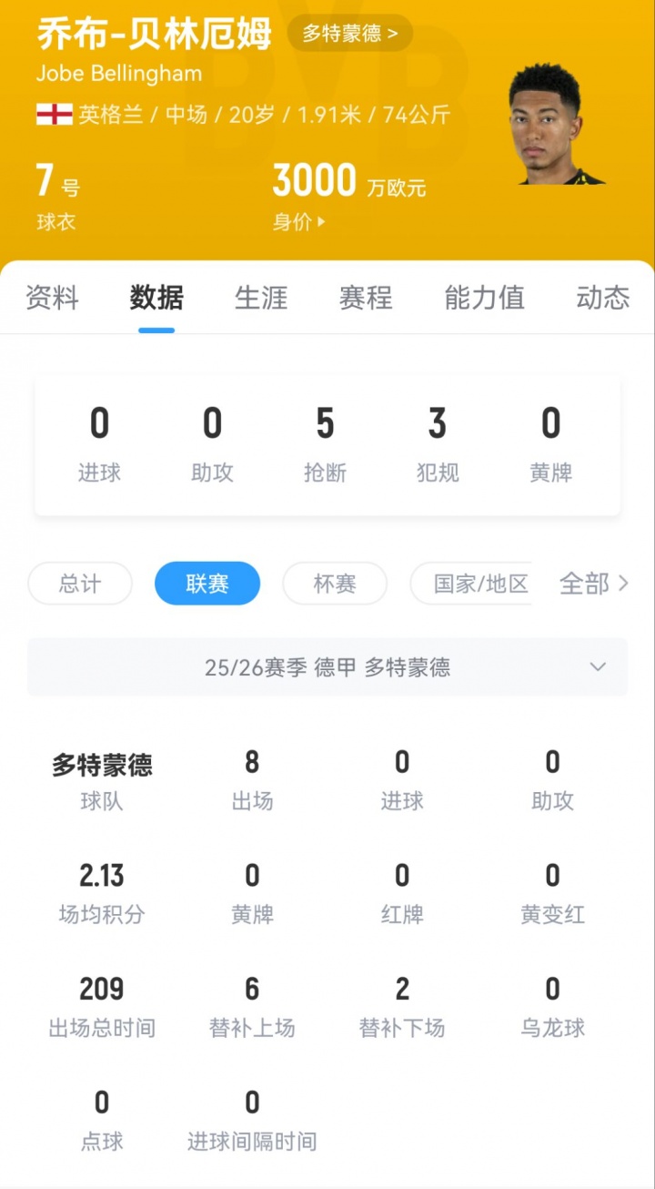 20岁的贝林厄姆本赛季照旧为多特在德甲出战8场比赛,莫得联赛进球或助攻,仅在上场欧冠对阵哥本哈根的比赛中孝顺2次助攻。现在他的德回身价为3000万欧元。