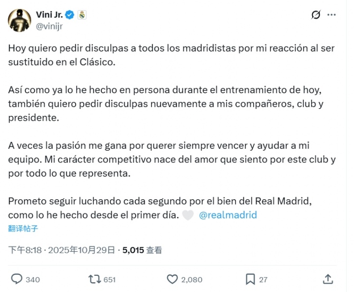 维尼修斯社媒致歉: