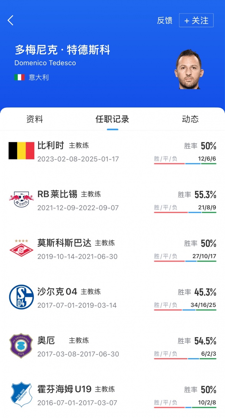 39岁前比利时队主帅特德斯科,此前曾抓教沙尔克04、莫斯科斯巴达、RB莱比锡等球队,他的上一份责任是2023年2月至2025年1月抓教比利时国度队,得回12胜6平6负后下课。特德斯科将接替此前下课的穆里尼奥。