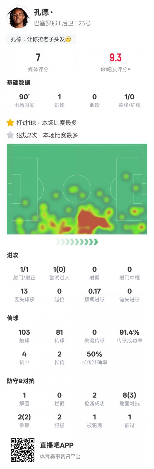 孔德本场比赛数据:1进球1突围2抢断+2次争顶均见效,评分7.0