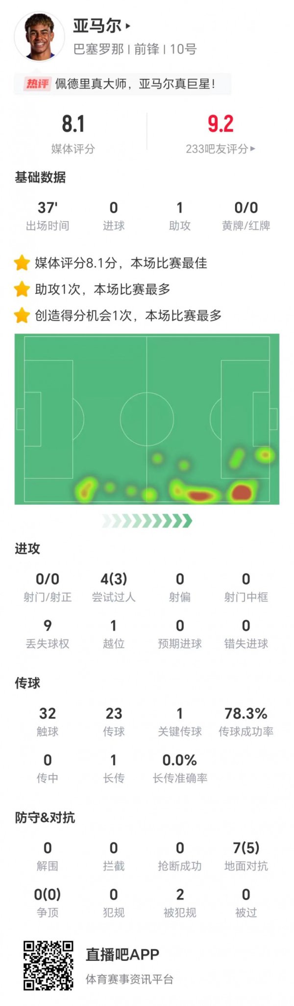 亚马尔数据:1次关节传球送出助攻,4次过东说念主凯旋3次,获评8.1分