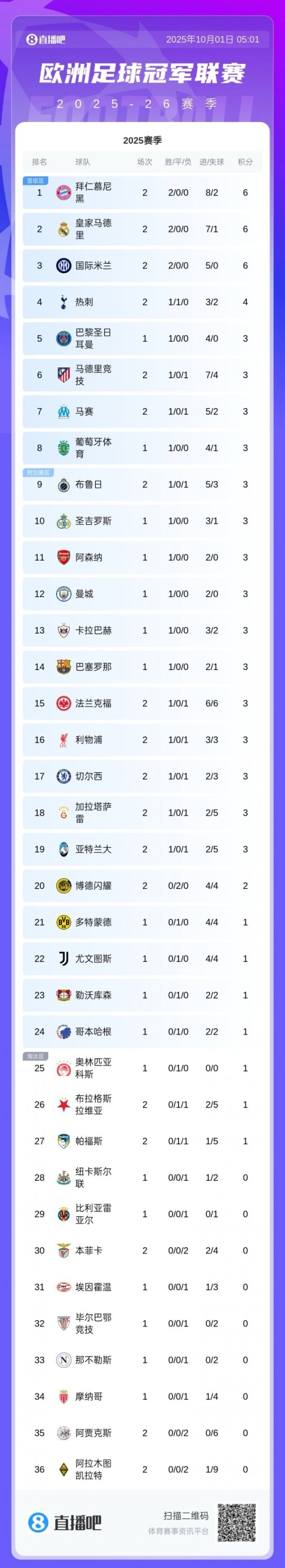 欧冠第2轮首日积分榜:拜仁皇马国米6分领跑!赤军输球跌至第16