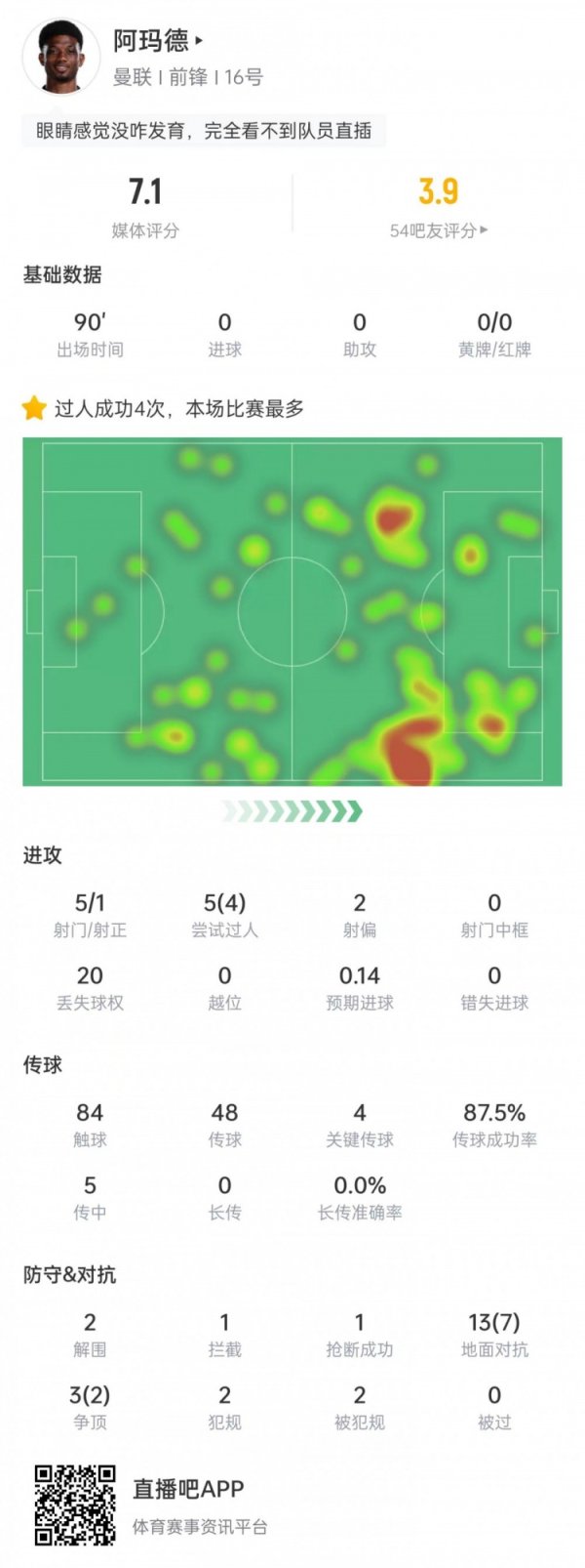 阿玛德本场数据:4次过东说念主成功全场最多,4次关节传球,获评7.1分