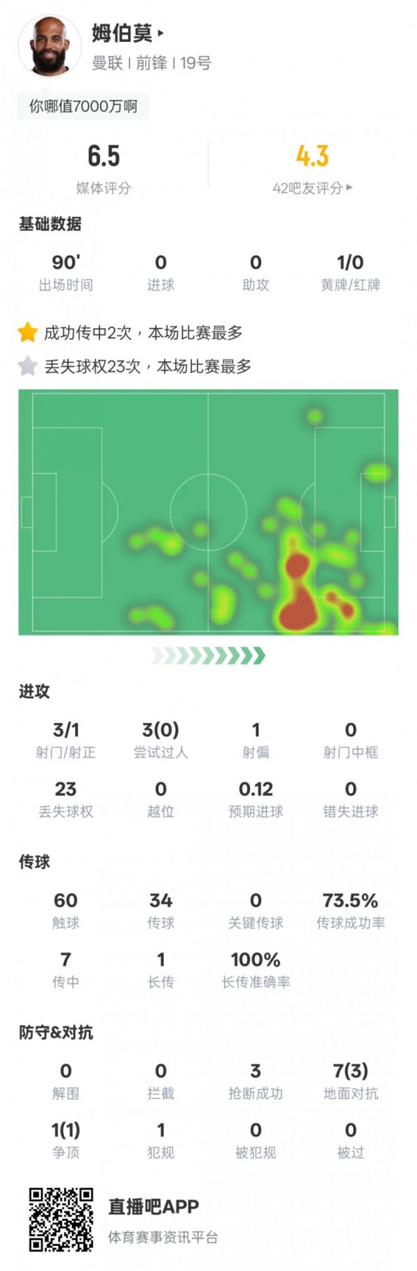 姆伯莫本场数据:3射1正+23次丢失球权全场最多,评分6.5