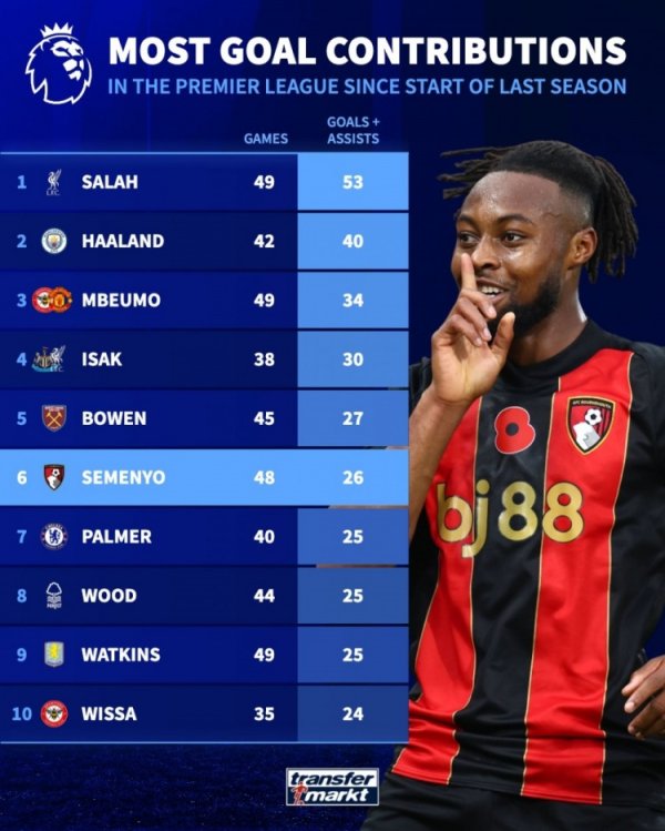 上赛季于今英超参与进球榜:萨拉赫53球居首,哈兰德40球次席