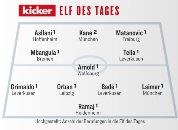 踢球者本轮德甲最好阵:凯恩领衔,格里马尔多、莱默尔入选