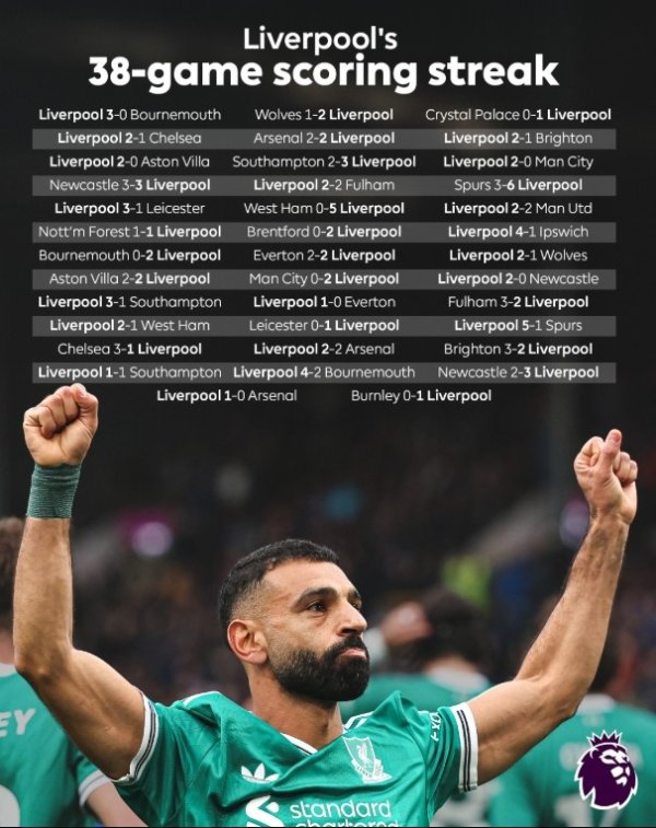 9月16日讯 凭据英超官方统计,利物浦齐集38场联赛得回进球。 9月14日,英超第4轮,利物浦1-0打败伯恩利,新赛季开局得回4连胜的收货,他们也齐集38场联赛得回进球。 利物浦前次英超莫得得回进球的比赛发生在旧年9月14日,那时他们在24-25赛季第4轮0-1不敌诺丁汉丛林。......查看更多