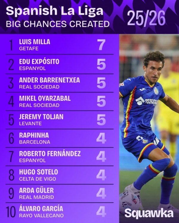 10月7日讯 日前,Squawka统计了本赛季西甲创造进球契机次数排名,拉菲尼亚、居勒尔4次比肩第六。 1、路易斯-米拉(赫塔费):7次 2、埃克斯波西托(西班经纪东说念主):5次 3、巴雷内切亚(皇家社会):5次 4、奥亚萨瓦尔(皇家社会):5次 5、杰雷米-托利安(莱万特):5次 6、拉菲尼亚(巴萨):4次 7、罗伯特-费尔南德斯(西班经纪东说念主):4次 8、索特洛(塞尔塔):4次 9、居勒尔(皇马):4次 10、阿尔瓦罗-加西亚(巴列卡诺):4次......查看更多