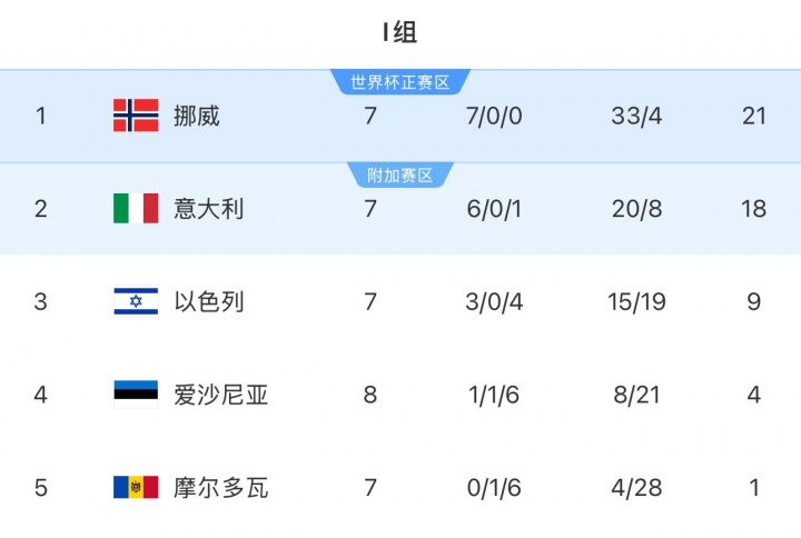 此外,在两边首回合交手中,挪威主场3-0完胜意大利,净胜球方面又拉开6球差距。