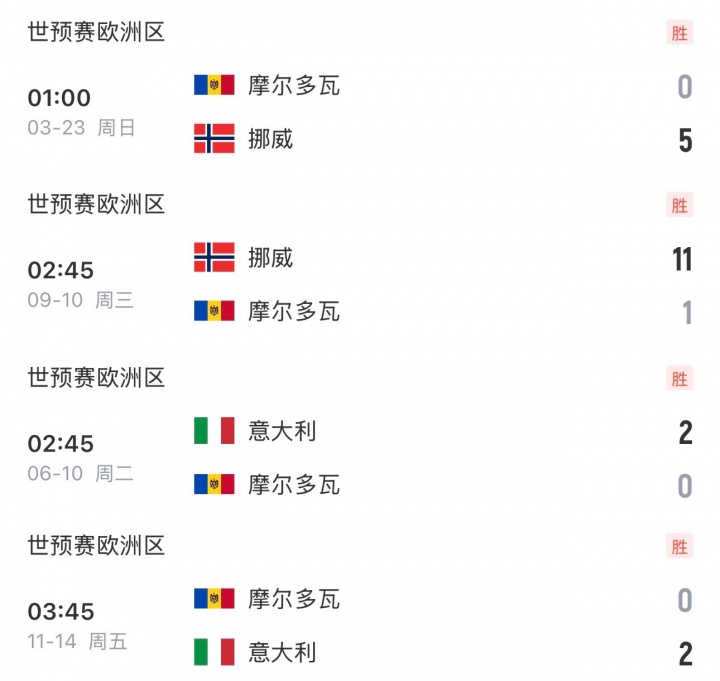 就输在虐菜?挪威2战垫底摩尔多瓦成绩15净胜球,而意大利仅取4球
