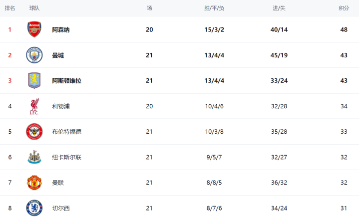 在积分榜上,曼联和阿斯顿维拉纷纷丢分,让阿森纳赚大了。阿森纳总积分是48分。曼城和阿斯顿维拉皆是43分。阿森纳跳跃5分,何况一经少赛一场。若是阿森纳接下来大略打败利物浦,将把上风扩大到8分。利物浦当今34分,名按次4。布伦特福德以33分名按次5。纽卡斯尔联和曼联皆是32分。