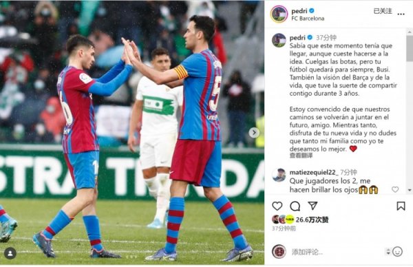 佩德里道贺布斯克茨:很侥幸与你共度三年时光,但愿你享受重生涯