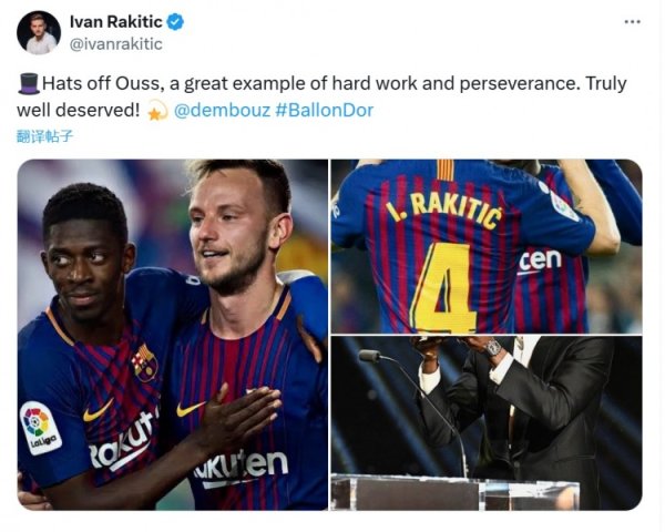 9月23日讯 在2025年金球奖授奖仪式上,登贝莱荣膺金球奖。 对此,前巴萨中场拉基蒂奇发文道喜:“🎩向登贝莱致意,他是勤快与坚合手的典范。实至名归!💫”......查看更多