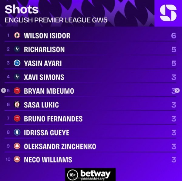 英超第5轮射门榜:伊西多6次居首,理查利森、亚辛-阿亚里5按序二
