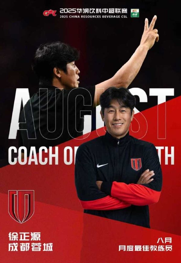 开导蓉城3胜1平!官方:徐正源当选中超8月最好西宾