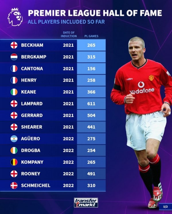 11月4日讯 德转清点了英超联赛名东说念主堂成员的英超比赛参与次数,具体如下: 2021届: 贝克汉姆,265场 博格坎普,315场 坎通纳,156场 亨利,258场 基恩,366场 兰帕德,611场 杰拉德,504场 希勒,441场 2022届: 阿圭罗,275场 德罗巴,254场 孔帕尼,265场 鲁尼,491场 舒梅切尔,310场 斯科尔斯,499场 维埃拉,307场 伊恩-赖特,213场 2023届: 弗格森,809场 温格,828场 费迪南德,504场 切赫,443......查看更多