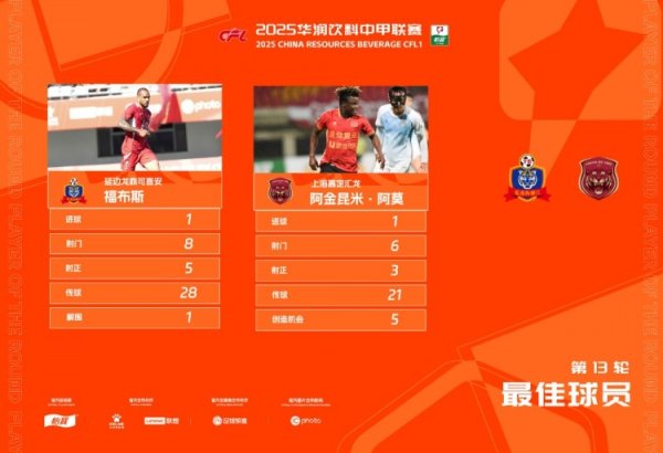 中甲官方:福布斯、阿金昆米-阿莫共同当选第13轮最好球员