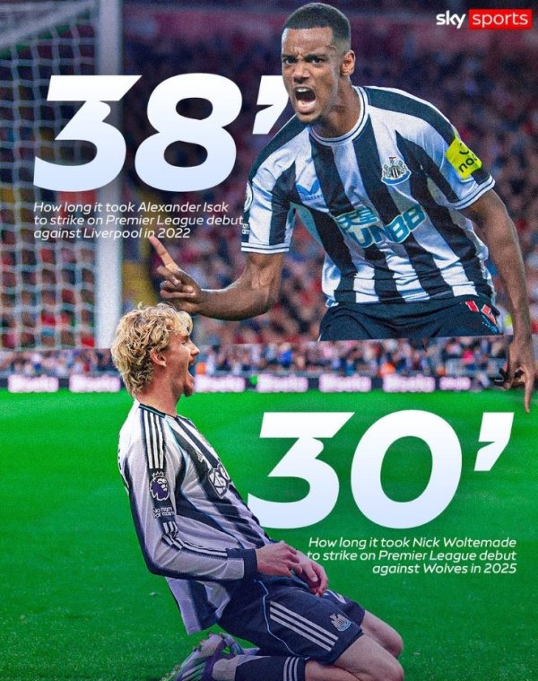 似曾知晓,伊萨克纽卡首秀38分钟破门,沃尔特马德则用时30分钟