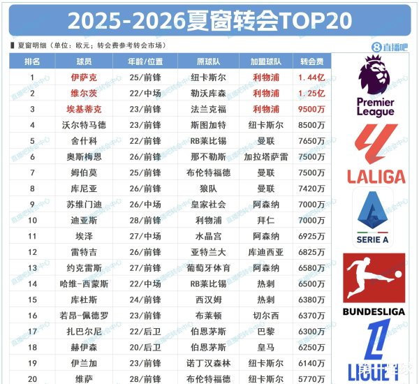 北京时刻今天凌晨2点,欧洲五大联赛夏窗厚爱关闭,不得不说,英超真实太有钱了,在夏窗转会TOP20中,英超占了16席,前三则是被利物浦包揽,伊萨克1.44亿欧,维尔茨1.25亿欧,埃基蒂克9500万欧。其中伊萨克和维尔茨均刷新了英超转会费记录。 上赛季,克洛普离任,利物浦险些扫数这个词夏窗莫得引援,但却打出了舒心淋漓的推崇,猖厥夺得英超冠军。这个赛季,赤军在原有的基础上猖獗引援,实力又有了不小的进步,英超三轮战罢,利物浦4比2伯恩茅斯,3比2纽卡,1比0阿森纳,积9分高居第一,......查看更多